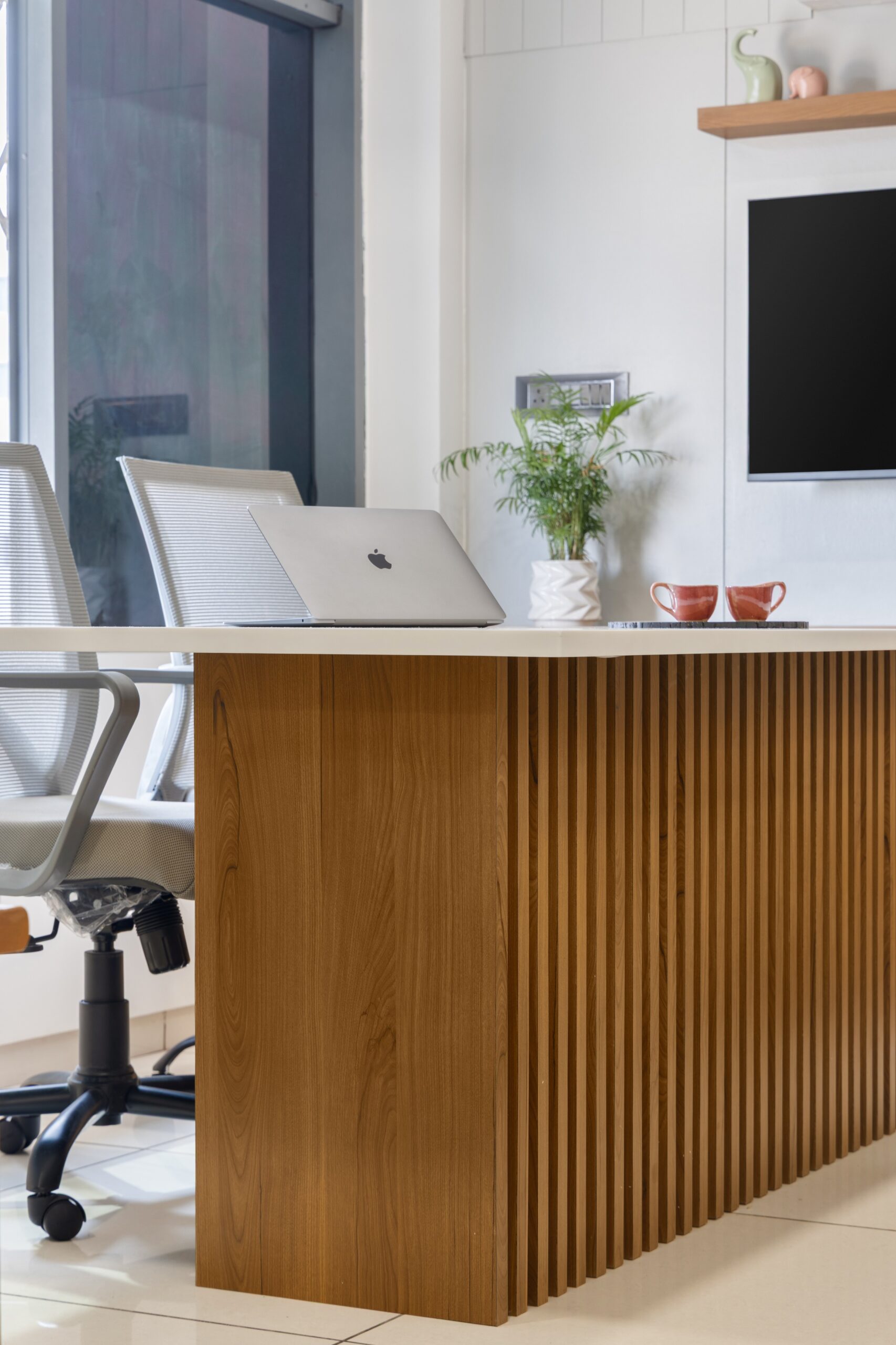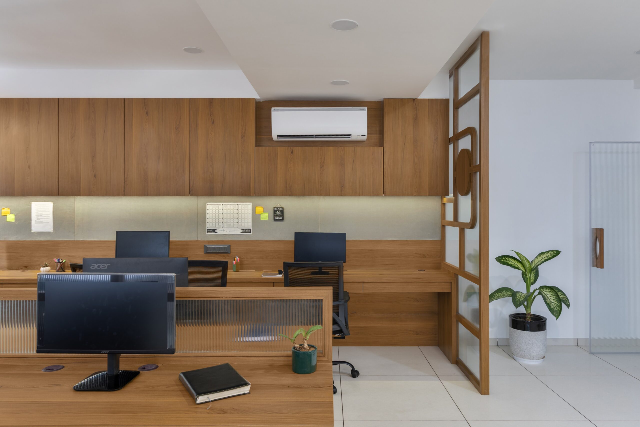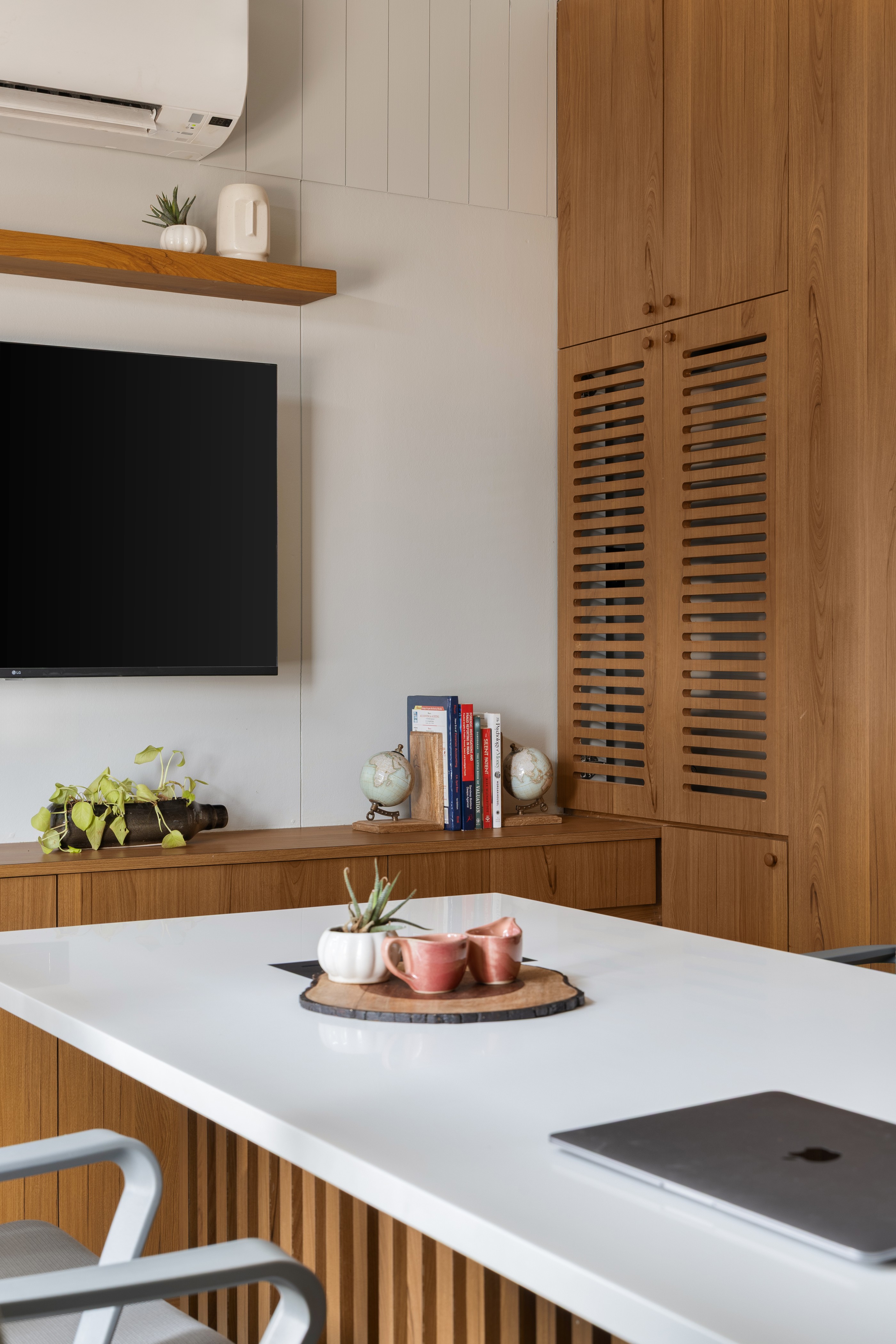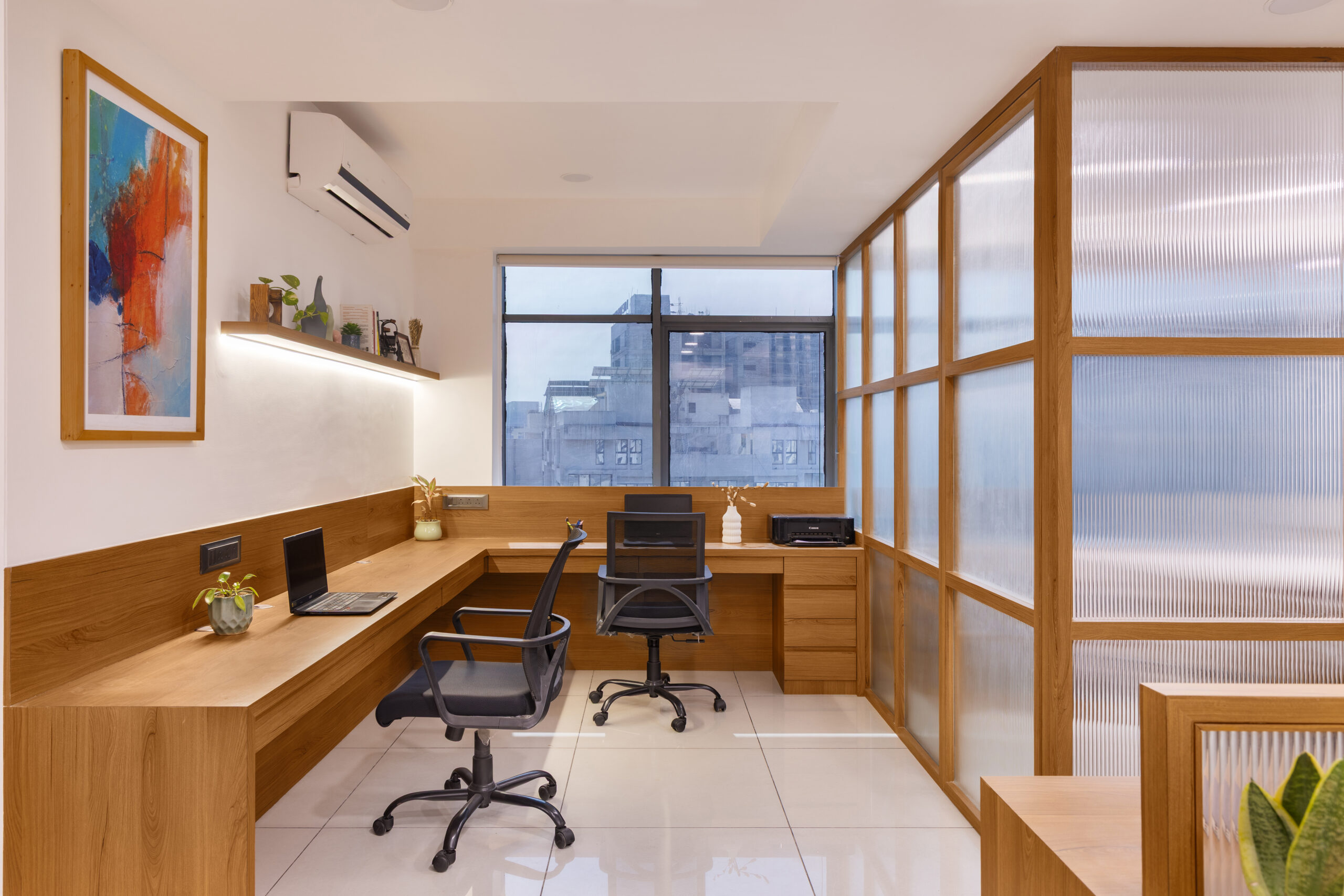A compact office designed for a finance professional, combining warm wooden tones, subtle hues, and natural textures to create an elegant yet functional workspace. Smart storage and minimal details ensure a clutter-free, focused environment.