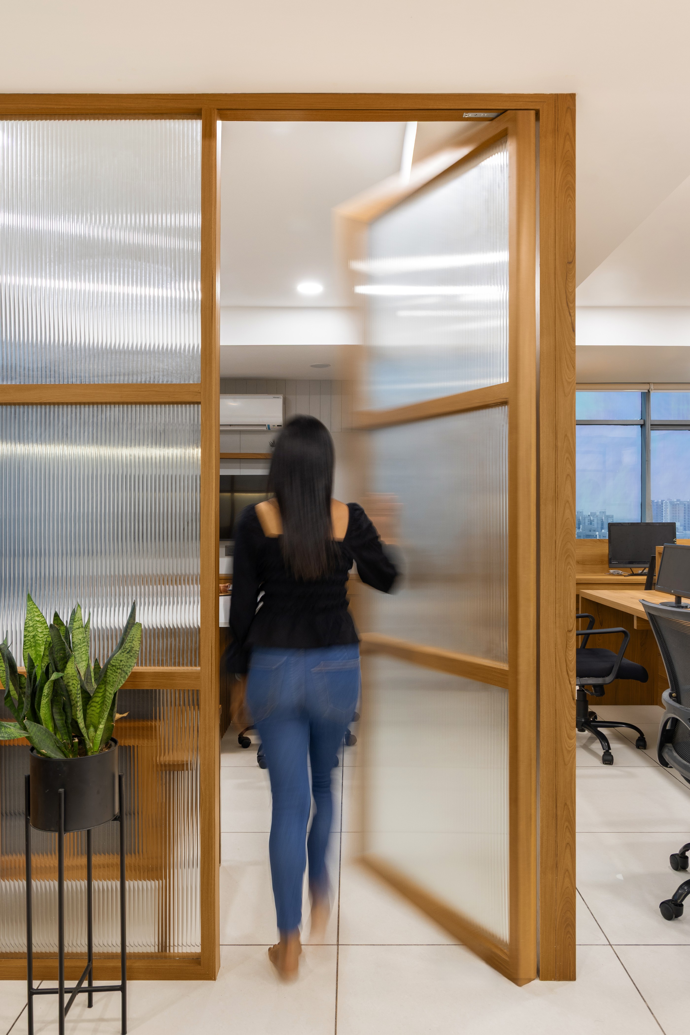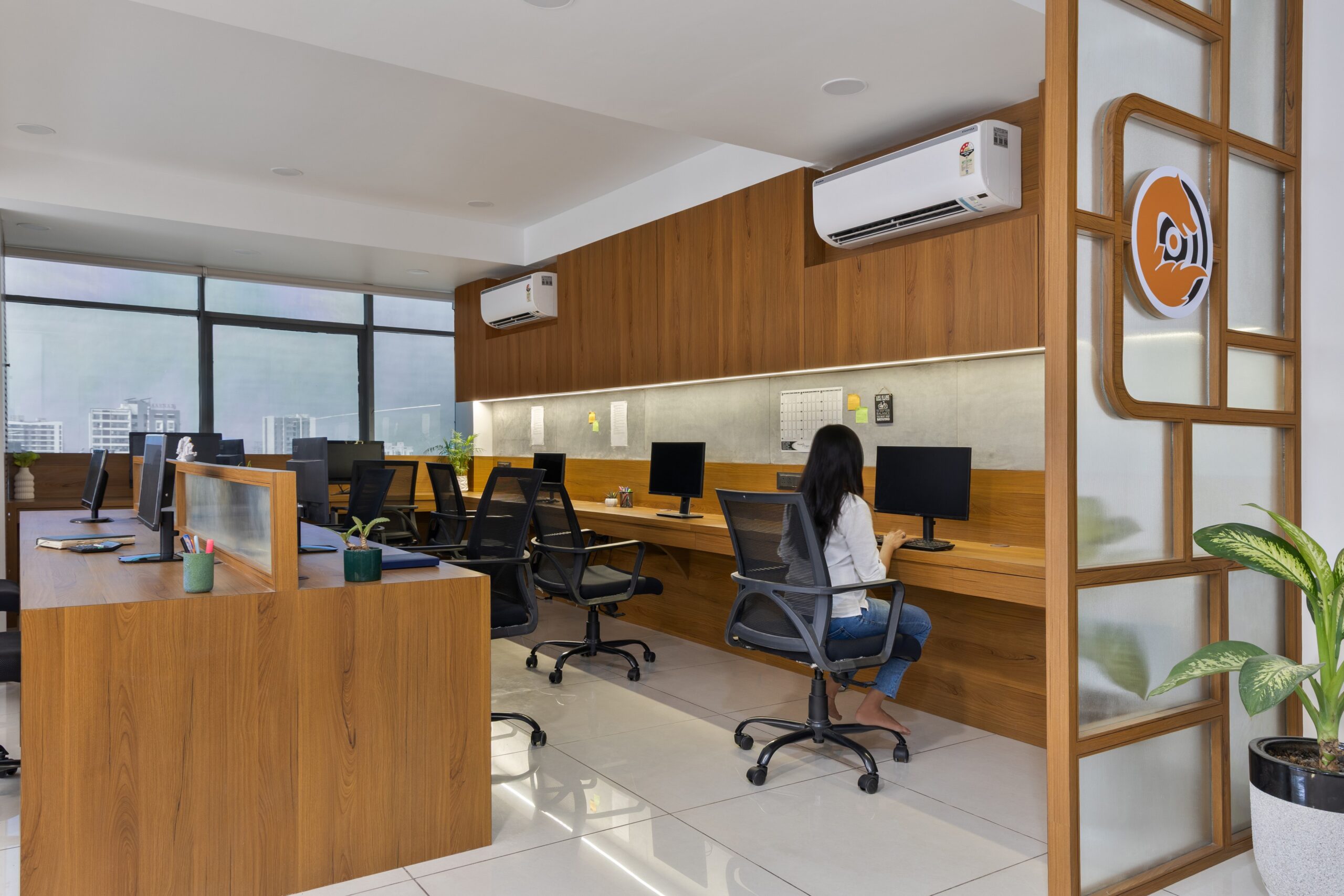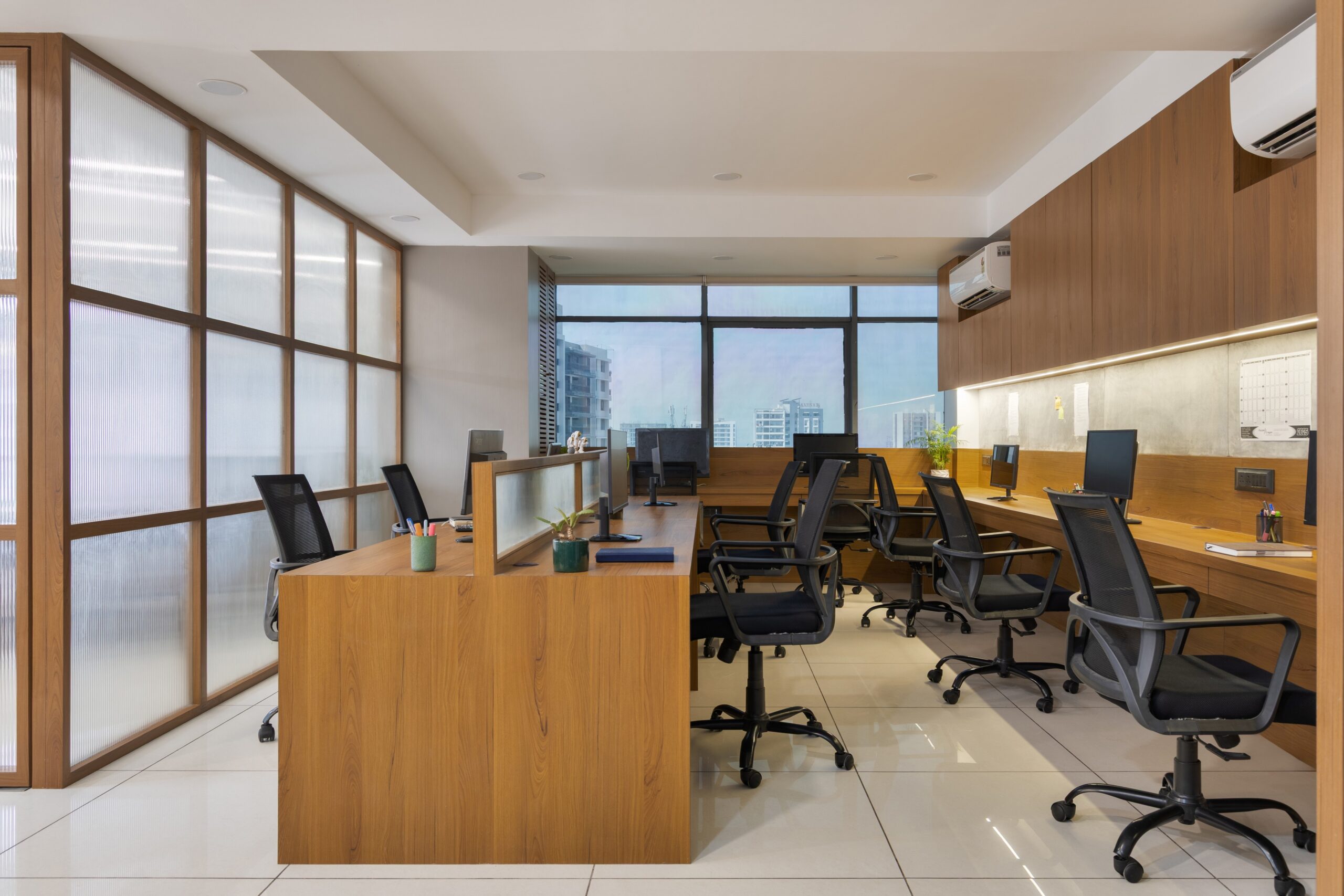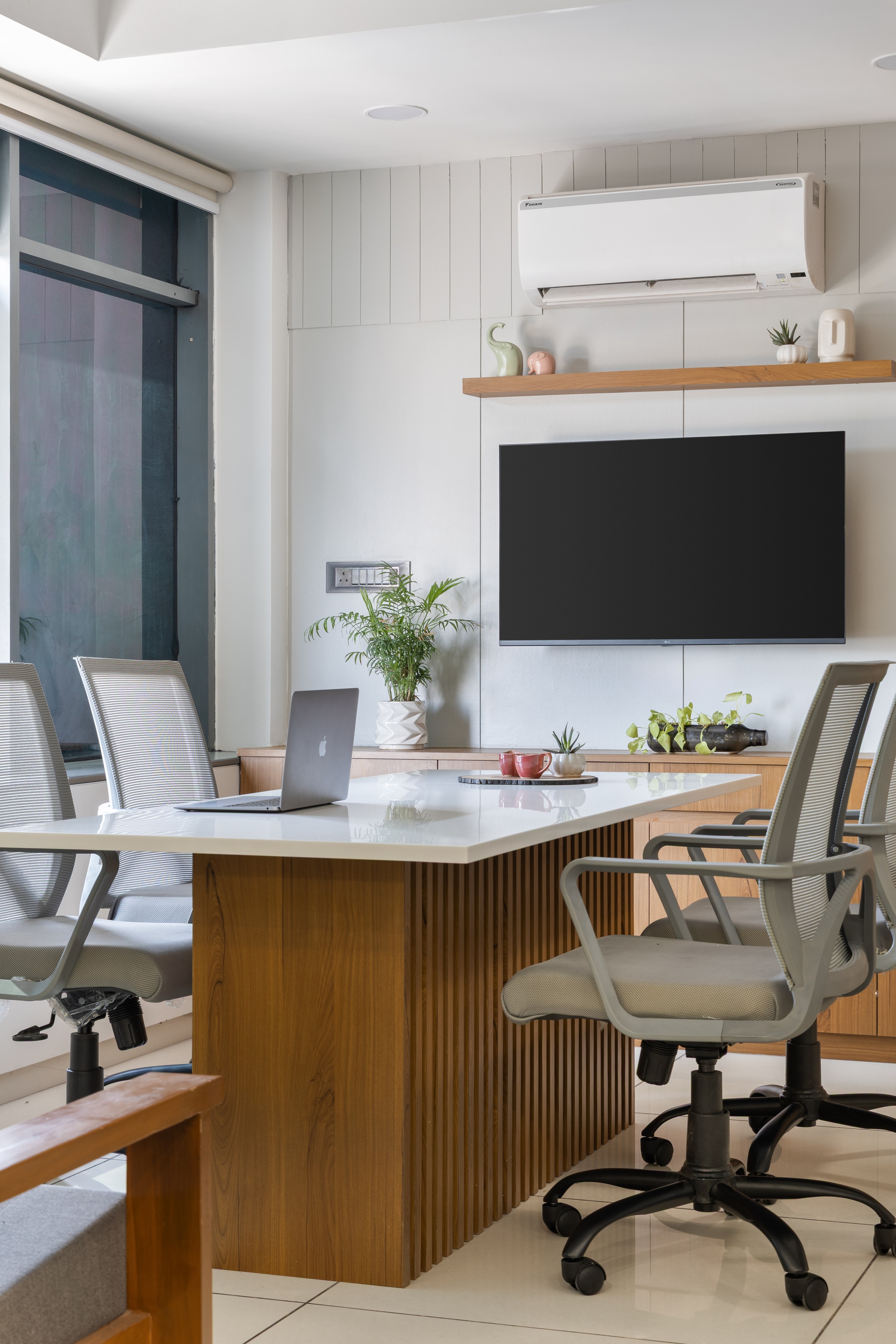A compact office designed for a finance professional, combining warm wooden tones, subtle hues, and natural textures to create an elegant yet functional workspace. Smart storage and minimal details ensure a clutter-free, focused environment.