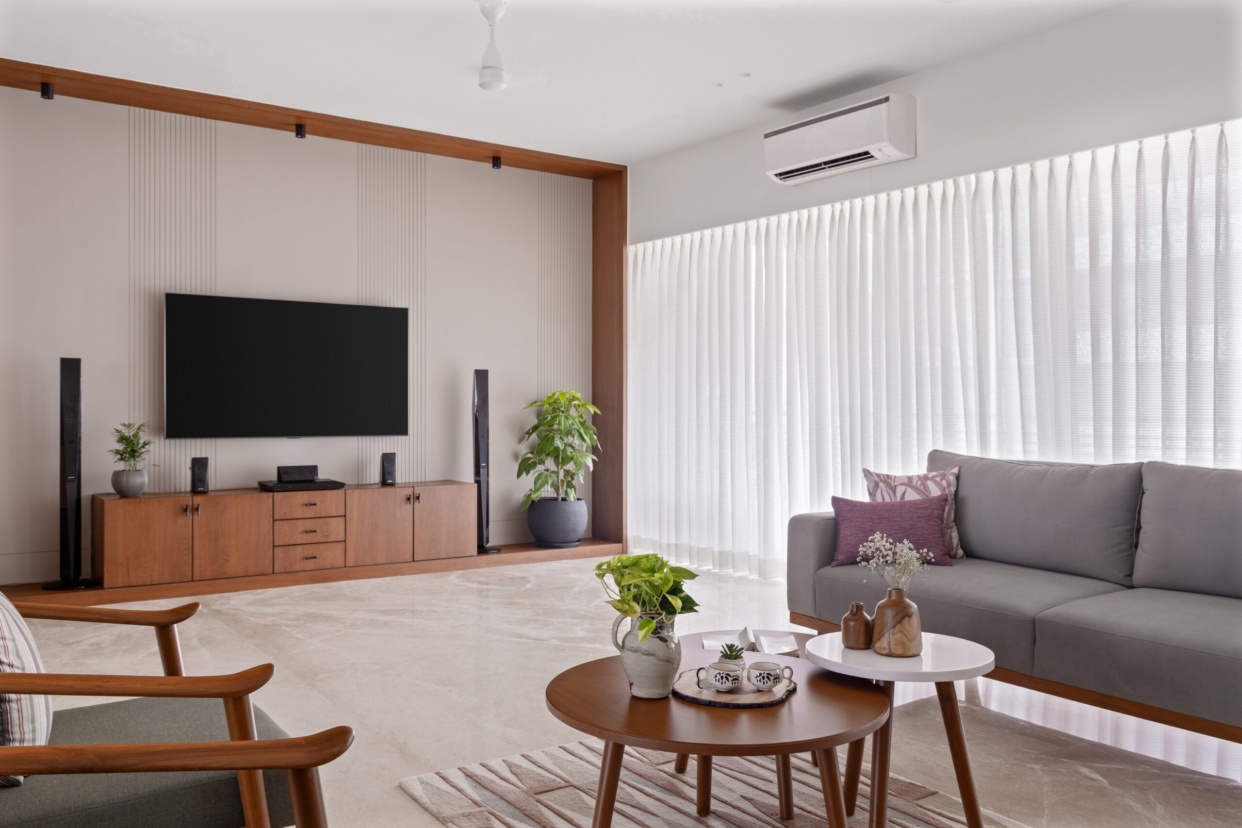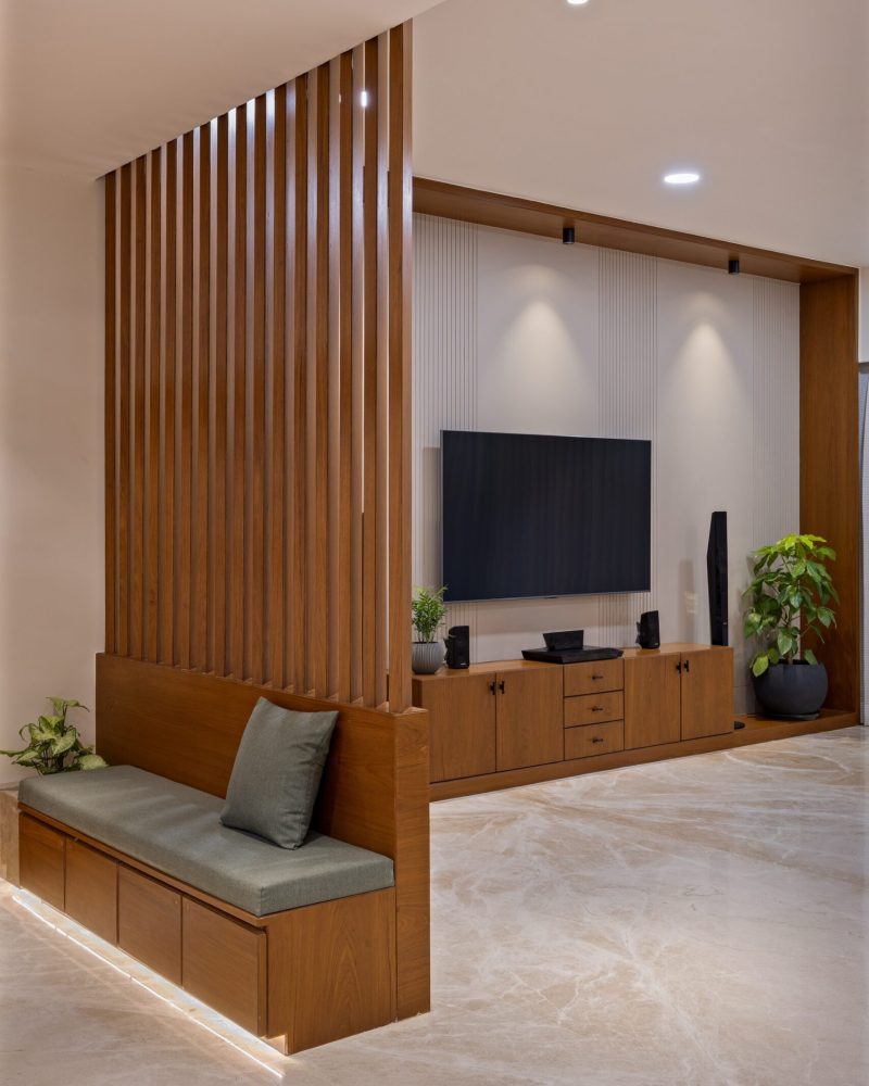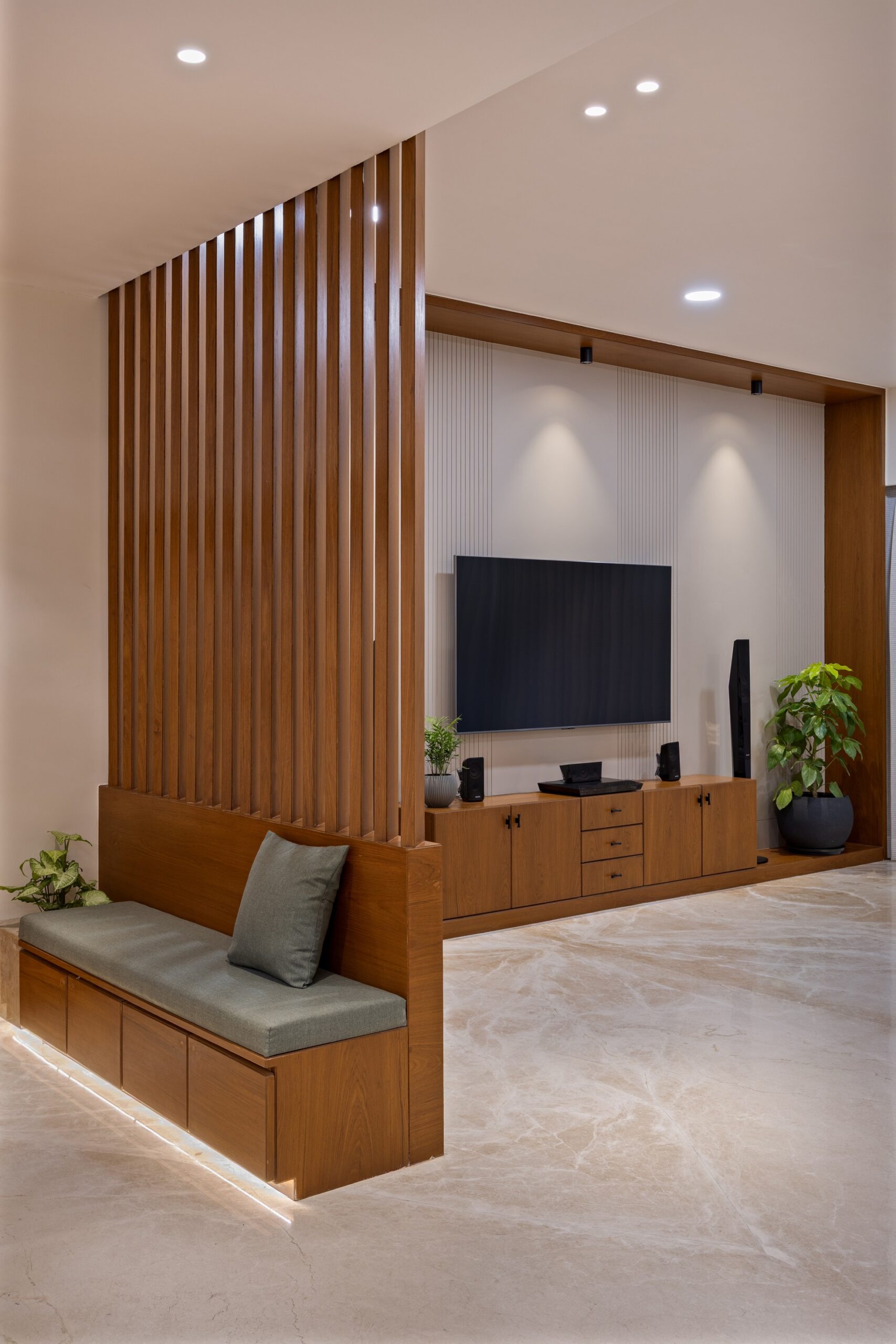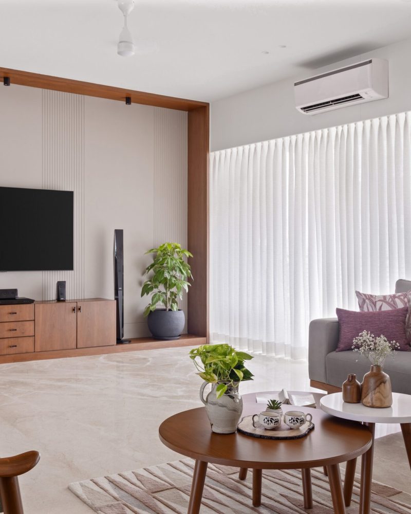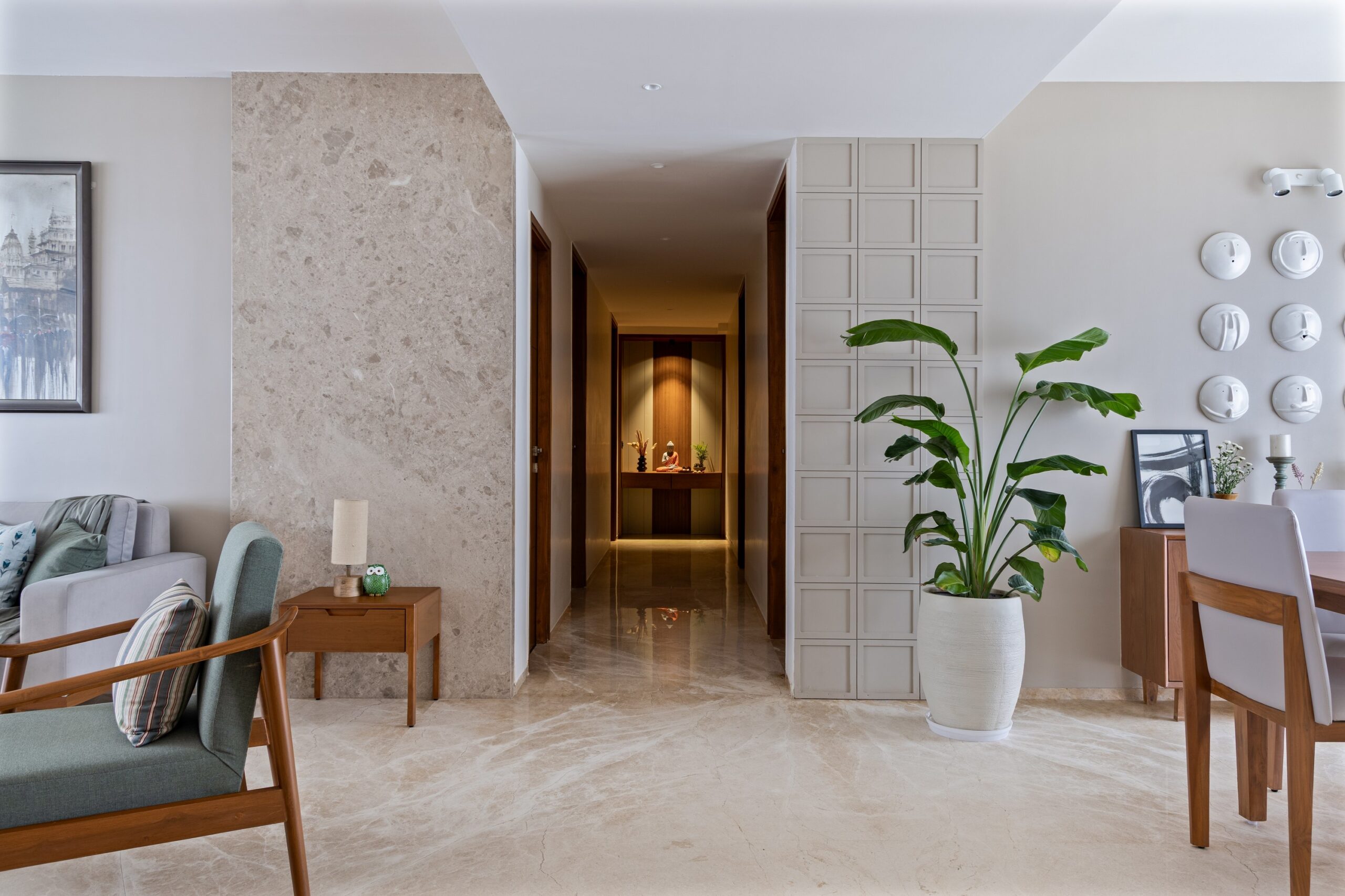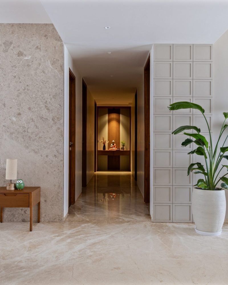 Designed without a formal brief, this 2000 sq. ft. home emerged from trust and creative freedom. A warm, minimal aesthetic unfolds through the seamless flow of beige Italian marble, clean vertical lines, and a restrained palette of wood and soft hues. Subtle partitions, custom details, and thoughtful furnishings add character while maintaining calm continuity, creating a home that feels elegant, functional, and quietly distinctive.